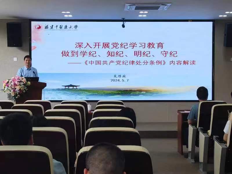 为加强党的纪律建设,引导党员学纪、知纪、明纪、守纪,5月16日,学院邀请校纪委副书记、纪委(监察专员办)综合室主任吴厚庭在精诚楼4217开展《中国共产党纪律处分条例》辅导学习。学院领导班子、教职工党员近100人参加。