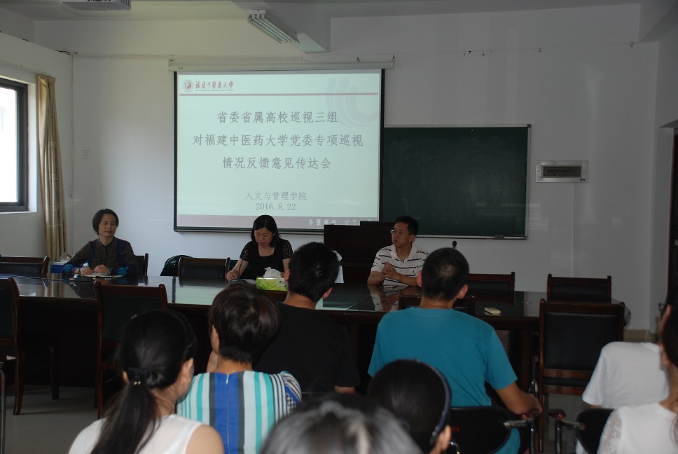 8月22日上午,我院召开党员大会专题传达省委省属高校巡视三组对福建中医药大学党委专项巡视情况反馈意见。学院党委副书记(主持党委工作)吴小云同志向全体党员传达了省委省属高校巡视三组巡视福建中医药大学情况反馈会精神。